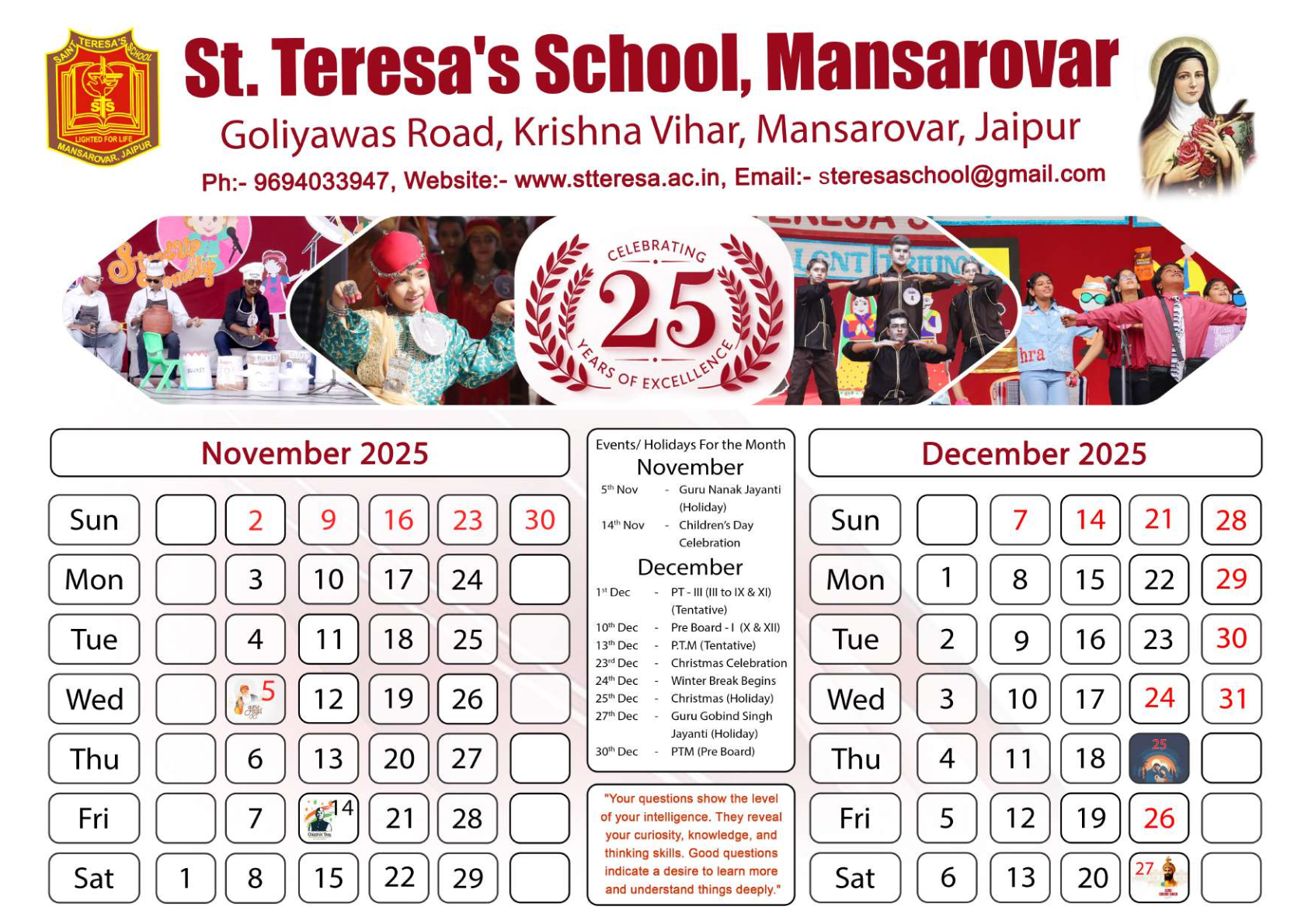 St. Teresa’s Sr. Sec. School Mansarovar Jaipur is run by Prabhudasi Sisters Education Society which is a registered body authorized to run schools, hospitals, dispensaries, old age homes, creche etc in different parts of the country. St. Teresa School is one of the many institutions under the management of Prabhudasi Sisters Education Society Ajmer which is a registered Society under Rajasthan Society Registration Act 1958. The school is co – educational and imparts education in English Medium (CBSE). Admission will be given to children of all communities treating their religious faith with due respect. The Academic year begins in April and ends in March.